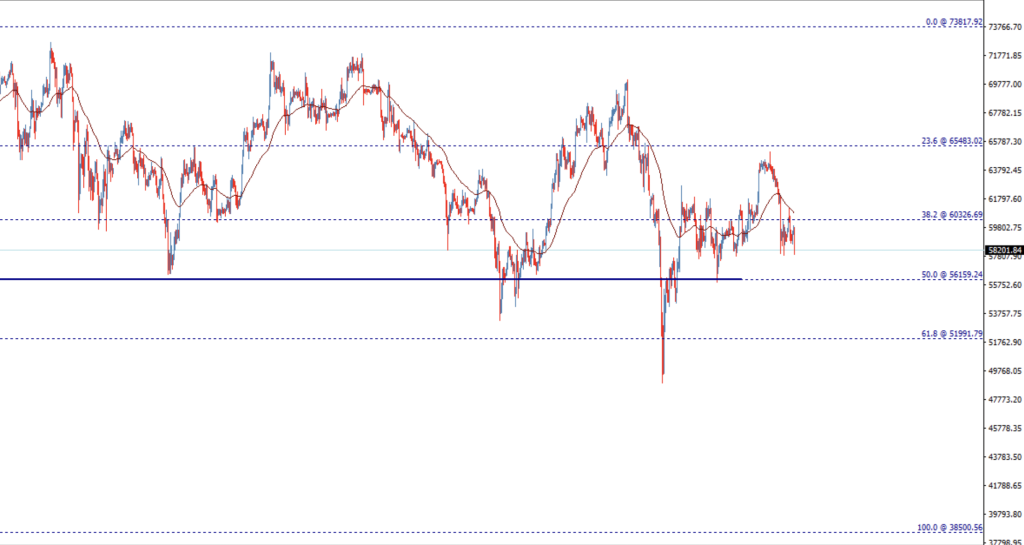 Bitcoin był notowany na poziomie 59 390 dolarów, co oznacza spadek o prawie 0,5%, podczas gdy Ethereum spadło o 1% do 2 525 dolarów.